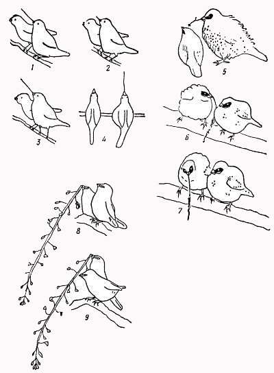 1–4 — у Estrilda, Lagonosticta и Euodice; следует обратить внимание на различное положение лапок в трех позах (1–3); 5–7 — то же подношение у Amandava amandava (5 — самец с взъерошенными перьями подносит веточку самке; 6 и 7 — самка подносит веточку самцу); 8 и 9 — такой же церемониал у Lagonosticta саеrulescens: птицы обоих полов подносят друг другу веточку, причем тот, кому делается подношение, довольно низко кланяется (9) (по Кункелю).