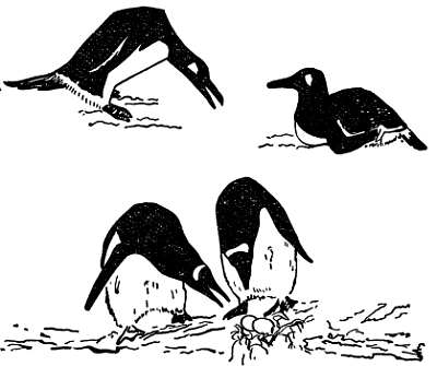 Рис. 48. Церемониал смены родителей, насиживающих яйца, на гнезде у длиннохвостых пингвинов Pygoscelis (по Робертсу).