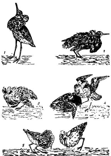 Рис. 49. Боевые позы турухтана (Phtlomachus pugnax).
