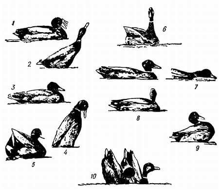 1 — покачивание клювом; 2 — клюв обращен кверху; 3 — помахивание хвостом; 4 — «свистящее урчание» (grunt-whistle); 5 — голова — вверх, хвост — вверх; 6 — самец поворачивается к самке; 7 — плавание с клювом у поверхности воды; 8 — самец отворачивает голову и показывает свой зеленый воротник; 9 — самец выпячивает грудь колесом; 10 — покачивание взад и вперед (по Рамзею).