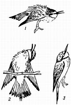 1 — «дождевая ванна»; перья взъерошены, клюв полураскрыт, глаза закрыты; 2 — солнечная ванна; 3 — другая поза под дождем (по Кёнигу).