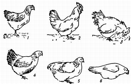 1 — поза доминирования, голова выпрямлена, перья слегка топорщатся; 2 — поза доминирования у петуха (отметить полусогнутые ноги); 3 — очень агрессивная поза; 4 — у курицы эта поза с полусогнутыми ногами означает, что она включается в стадо и не имеет каких-либо агрессивных намерений, в противоположность позе 1; 5 — поза подчинения; 6 — самка в приглашающей позе (по Формену и Элли).