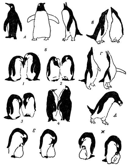 А — позы во время ходьбы; Б — императорский пингвин, различные позы (1–4) при демонстративном поведении; В — два аделийских пингвина трутся клювами, будто с намерением их отточить; Г — поза «экстаза»; Д — аделийский пингвин, несущий камень в свое гнездо; Е и Ж — кормление молодые пингвинов (по Сапен-Шалюстру, Рихдалю и Прево).