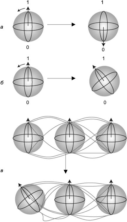 Рис. 8.4. Бит классического компьютера в виде сферического компаса: а — классический бит, переключаемый с 1 на 0, представлен как вращение классической сферы на 180°; б — кубит (квантовый бит), переключаясь, может быть представлен как вращение сферы через любой произвольный угол. Тем не менее когерентный кубит может быть также в суперпозиции для множества вращений; в — три когерентных кубита в состоянии запутанности, как будто воображаемые нити соединяют поверхности каждой сферы. Натяжение этих нитей, следуя вращениям, иллюстрирует квантовые вычисления