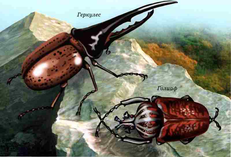 Самым большим жуком на планете считается жук-геркулес. Вместе со своими роговыми выростами он достигает длины 17,5 см! Этот жук обитает на Малых Антильских островах, в тропической Америке. Самка его поменьше, совсем черная и без выростов. Очевидно, выросты играют роль в соперничестве самцов за территорию и даму сердца, как и у наших жуков-оленей. В Бразилии обитает дровосек-титан (до 18 см); немногим уступает ему в размерах (до 14 см) дровосек-большезуб. Личинок таких гигантов местное население употребляет в пищу и считает лакомством. Яркая окраска большезуба является прекрасной маскировкой на стволах тропических деревьев. Подобным образом маскируется и жук-арлекин. Обитает он тоже в Бразилии.
