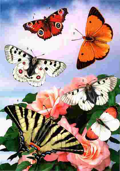 1 — дневной павлиний глаз, 2 — желтушка, 3 — аполлон, 4 — подалирий, 5 — мнемозина, 6 — зорька