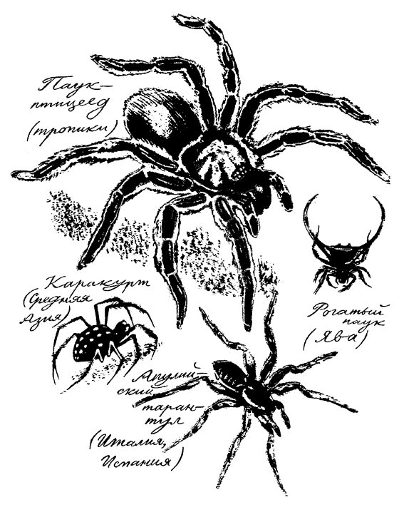 Есть такой паук — тарантул. Это совсем не ядовитый паук и вовсе не опасный, но большинство людей даже сейчас убеждены в его ядовитости, в том, что он гораздо опаснее всех прочих пауков. Много столетий считалось, что укус тарантула вызывает особую болезнь — «тарантизм». У больного тарантизмом начиналась лихорадка, озноб, боль во всем теле и вместе с тем появлялось желание смеяться, танцевать.