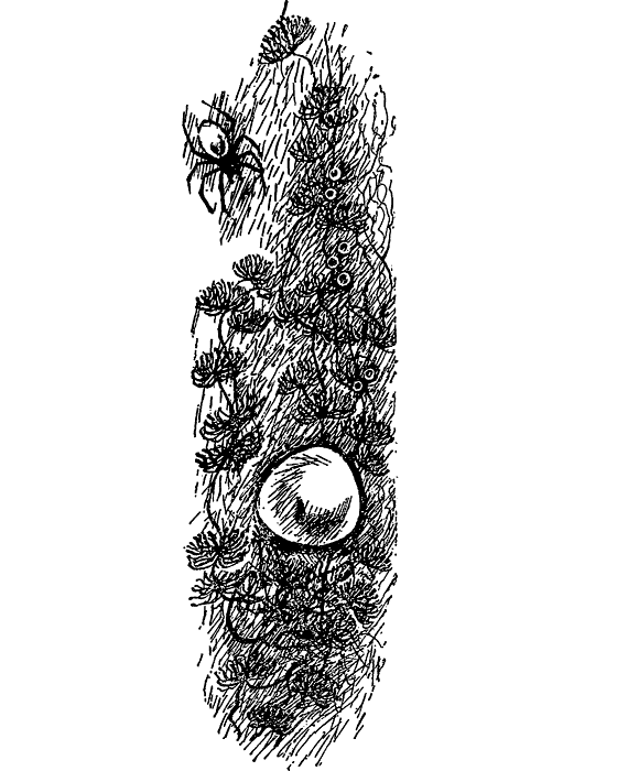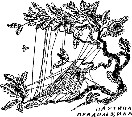 Сначала я не обратил внимания на слова крестовика, а старался понять, почему муха сразу упала в сеть, обо что она споткнулась. Я подошел к сети прядильщика и лишь тут увидел, что над ней отвесно натянуты тончайшие нити. Не только я их не замечал — их не замечали и насекомые, пролетающие над сетью. Теперь все ясно. Насекомые не видят натянутых нитей, ударяются о них и падают в сеть. Вдруг я вспомнил слова крестовика о яде.
