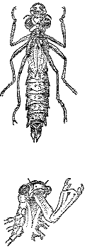 Личинки стрекоз делятся на три хорошо различимые группы: тип коромысло, собственно стрекозы и лютки. Для всех личинок характерны общие черты строения: голова с короткими, вперед направленными усиками, более или менее крупные фасеточные глаза, наличие снизу головы так называемой «маски», грудь с тремя парами ходильных ножек и зачатками крыльев на спине и брюшко разного размера и формы. У стрекозы — неполное превращение, отсутствует фаза куколки, поэтому личинок с зачатками крыльев иногда называют нимфами (рис. 24).