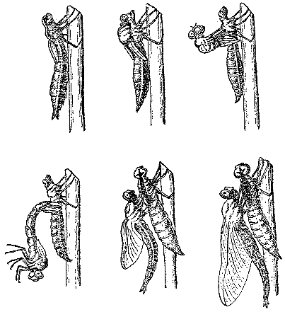 Рис. 25. Последовательные стадии выхода стрекозы-коромысла
