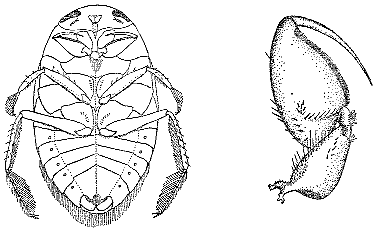 Клопы, живущие на субстрате. Водяной скорпион, как и гладыш, широко распространен в наших водоемах. Рассматривая внешний вид клопа (рис. 31), следует обратить внимание на две задние пары ног, сравнить с ногами у свободно плавающих клопов. Ноги скорпиона лишь слегка опушены волосками, морфологически аналогичны ногам наземных клопов и почти не претерпели особых изменений при перемещении из воздушной среды в водную. В основном они выполняют сходные функции, служат для передвижения по субстрату. Но клоп может передвигаться с их помощью, гребет обеими парами, плавает медленно, отрывается от субстрата неохотно.