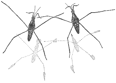 На дне сосуда образуется тень от расположенного на поверхности воды насекомого, при этом на месте лапок будут видны широкие темные овалы типа таежных лыж. На самом деле никакого расширения соприкасающихся с водой концов ножек нет, нет и широко раздвигающихся волосков, как предполагали раньше (подобную тень от водомерки можно увидеть и на песке водоема). Это оптический эффект, связанный с вогнутостью под тяжестью ноги поверхностной пленки воды и лучепреломлением (рис. 32).