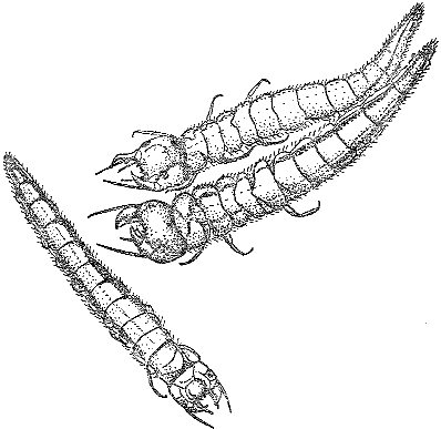 Толстая серая личинка плавает плохо, ее ножки слабовыражены, поэтому она предпочитает передвигаться по растениям. В основном питается улитками и другими малоподвижными животными. Схватив катушку и прикрепившись к растению или пассивно качаясь у поверхности, личинка выбрасывает над водой голову. С помощью жвал и щупиков она ощупывает раковину, поворачивает ее, дробит, на тело моллюска отрыгивает пищеварительные соки и полупереваренным поедает. Действие этих соков возможно только вне воды, поэтому личинка высовывает голову. Каналов в жвалах нет, пищу она засасывает ртом (рис. 37).