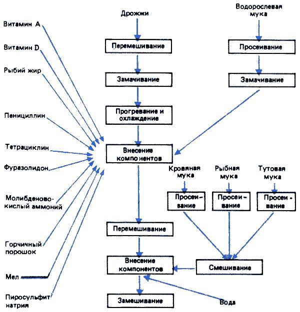 5. В охлажденные дрожжи при постоянном тщательном перемешивании вносят: пенициллиновый мицелий (или пенициллин), витамины, рыбий жир, биомицин (тетрациклин), фуразолидон, молибденовокислый аммоний, горчичный порошок, пиросульфит натрия и набухшую водорослевую муку. Полученную полужидкую массу замешивают с сухой смесью кровяной, рыбной и тутовой муки при постепенном добавлении оставшегося количества воды для получения желаемой консистенции.