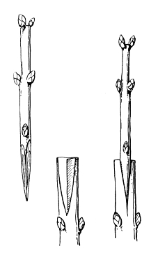 На зачищенном подвое нож ставят наклонно к оси подвоя. Полотно ножа направляют на край среза пенька ближе к середине побега, вырез получается более узким.