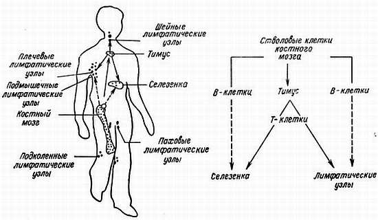 Стволовые клетки (предшественники) лимфоцитов мультипотентны. Они дифференцируются и формируются в Т- и В-клетки в тимусе и костном мозгу соответственно при помощи механизмов, которые пока не выяснены. Считают, что за созревание Т-клеток отвечает тимозин, гормон тимуса. Голдстейн [37] сообщил, что тимозин включает в себя ряд полипептидных гормонов. Фракция тимозина α1 является кислым и термостабильным белком. Его полипептидная цепь состоит из 28 аминокислотных остатков и имеет мол. массу ~3108. Фракция α1 вызывает в субпопуляциях Т-клеток изменения, характерные для процесса созревания, а также функциональные изменения in vitro и in vivo. После клинического применения тимозина у детей с врожденным иммунодефицитом обнаруживают увеличение числа Т-клеток и стимуляцию их функции. Сообщают также, что в клинике тимозин увеличивает время жизни больных раком.
