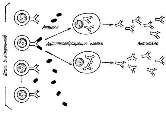 Механизм, по которому все плазматические клетки, образованные клоном В-клеток, вырабатывают иммуноглобулин только одного типа, по-видимому, включает особое расположение специфических молекул Ig на специфических клонах В-лимфоцитов, подходящее для того, чтобы они могли служить рецепторами. Это может происходить во время созревания стволовых клеток в фабрициевой сумке или костном мозге. Связывание специфического антигена со специфическим иммуноглобулиновым рецептором стимулирует деление В-клеток. На этой стадии может также происходить селекция вариабельного гена, константного гена для χ- и λ-цепей и константного гена для Н-цепи с целью синтеза специфического иммуноглобулина.