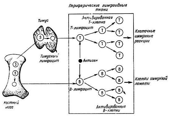 Иммунные реакции животных и человека на различные чужеродные вещества, вирусы, бактерии и чужеродные клетки осуществляются лимфоцитами двух видов — В- и Т-клетками. В-клетки формируются в фабрициевой сумке у птиц и в костном мозгу у млекопитающих. После стимуляции специфическим антигеном они вырабатывают специфические антитела или иммуноглобулины. Иммуноглобулин инактивирует антиген. Функция В-клеток зависит от кооперации с Т-клетками. Исследования последних лет показывают, что функция В-клеток с возрастом существенно не нарушается.
