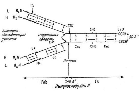 Основная структура иммуноглобулина включает две короткие, или легкие (L), и две длинные, или тяжелые (Н), цепи. Отсюда молекулярная формула мономера иммуноглобулина L2H2. L-цепь содержит ~216 аминокислотных остатков, и ее мол. масса составляет ~25000. Н-цепь содержит 430 аминокислотных остатков, а ее мол. масса ~50000, т. е. мол. масса Ig ~150000. NH2-конец половины L-цепи, содержащий около 108 остатков, называется вариабельной (V) областью, так как в этой области обнаруживают большинство замен аминокислотных остатков L-цепи различных Ig. Более того, эта область имеет три гипервариабельных (hv) участка, где находится наибольшее число изменений. COOH-конец полуцепи называется константной (С) областью. Каждая L-цепь. ковалентно связана с одной Н-цепью S — S-связью через цистеиновый остаток ее COOH-конца. Известны два типа L-цепей — каппа (χ) и лямбда (λ), которые отличаются друг от друга аминокислотными последовательностями константных областей. Обе L-цепи любого Ig принадлежат к одному типу, χ или λ. L-цепи синтезируются в шероховатом эндоплазматическом ретикулуме на полисомах, состоящих из 6–8 рибосом. Их синтез происходит независимо от синтеза Н-цепей.