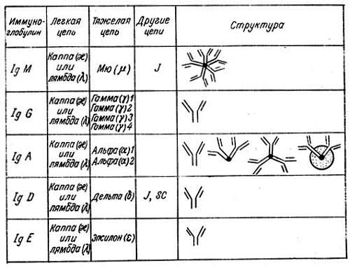 Около 108 остатков NH2-конца Н-цепи, что является первой ее четвертью, составляют вариабельную область. В каждой вариабельной области имеются три гипервариабельных участка. Остальные три четверти Н-цепи являются константной областью. Две Н-цепи Ig ковалентно связаны друг с другом S — S-связями в их константных областях. По последовательности константных областей различают пять типов Н-цепей: альфа, (α), дельта (δ), эпсилон (ε), гамма (γ) и мю (μ); они положены в основу классификации иммуноглобулинов, в соответствии с которой последние разделяются на пять классов: IgA, IgD, IgE, IgG, IgM. Иммуноглобулины D, E и G представлены мономерами. Иммуноглобулин А имеет мономеры и димеры (L2H2)2. Иммуноглобулин М содержит только пентамеры (L2H2)5. Димеризации IgA способствуют две экстраполипептидные цепи — связывающая цепь (J) и секреторный компонент (SC). Пентамерная форма IgM существует благодаря наличию J-цепей, которые ковалентно связывают пять мономеров. Иммуноглобулины всех пяти классов имеют углеводные компоненты, прикрепленные к константным областям их Н-цепей.