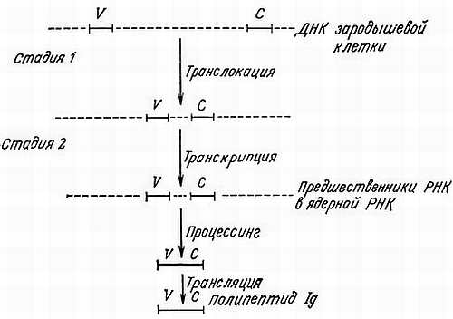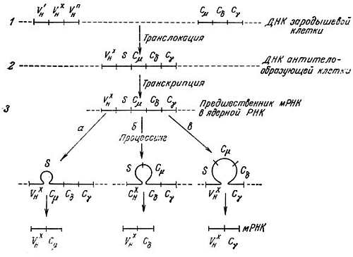 Гены вариабельных и константных областей L- и Н-цепей не соседствуют друг с другом [10, 23, 75, 93]. В стволовых клетках эмбриона они разделены большими промежуточными областями. Во время процессинга в костном мозге или в фабрициевой сумке V- и С-гены, очевидно, сближаются путем перестройки ДНК, но остаются разделенными промежуточной последовательностью. Селекция V и С-геное возникает, вероятно, после того, как антиген связывается с В-лимфоцитом. При этом V- и С-гены транскрибируются как единый предшественник гетерогенной ядерной РНК (гяРНК), имеющий нетранслируемую последовательность. Затем гяРНК подвергается в ядре сплайсингу и процессингу, в результате чего появляется зрелая мРНК, которая транслируется с образованием L-цепи, имеющей смежные V- и С-области. Описанная модель иллюстрируется рис. 7.8 и 7.9 [93]. В ней видны черты, сходные с транскрипцией и образованием предшественников мРНК для овальбумина и глобулина, которые также имеют промежуточные нетранслируемые последовательности, или интроны.