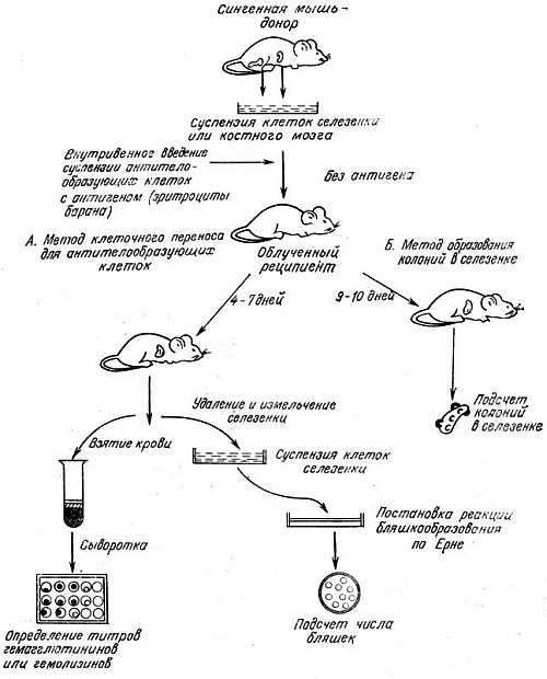 Рис. 7.10. Схема метода клеточного переноса для исследования образования антител и стволовых клеток [73]