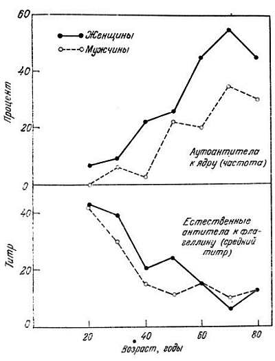 Рис. 7.11. Снижение титров естественных антител к флагеллину Salmonella с возрастом и увеличение частоты антиядерных факторов у людей обоих полов [99]