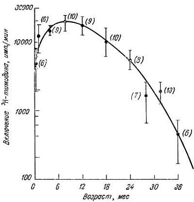 Некоторые данные, полученные in vitro, подтверждаются наблюдениями in vivo. Пролиферативный ответ Т-клеток на растительные митогены ФГА и конканавалин А у мышей и человека с возрастом значительно снижается [1, 29, 41, 56, 63, 88, 90, 97]. Вряд ли это обусловлено уменьшением связывания митогенов с рецепторами клеточных мембран [54], так как количество 125I-ФГА одинаково в молодых и старых клетках. Причиной могут быть молекулярные изменения, поскольку известно, что уровень циклического ГМФ (cGMP) после стимуляции митогеном в старых клетках увеличивается меньше, чем в молодых [45]. Правда, Эгервол и др. [2] сообщают, что при 37 °C ФГА одинаково стимулирует к делению и молодые, и старые клетки. Митотическая активность была изучена по включению 3Н-тимидина (рис. 7.13). Точность считывания ДНК-полимеразой в лимфоцитах двух доноров разного возраста тоже была одинаковой, хотя "старый" фермент оказался более термолабильным. Известно, кроме того, что ацетилирование гистонов в лимфоцитах, стимулированных ФГА, с возрастом снижается [85]. У мышей по мере старения замедляется образование цитотоксических лимфоцитов в смешанной культуре [47] и ослабевает функция Т-хелперов [42, 46, 91, 92].
