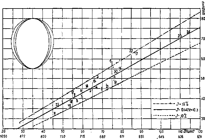 Слева контуры широкого, среднего и узкого яйца. Нижний ряд цифр — величина индекса, отвечающая линии регрессии. Точки 22 и 17 следует сдвинуть на одну клетку вниз.