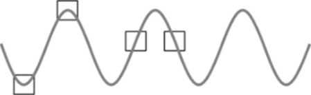 Рис. 14.5. Экспрессия определенной РНК в клетке может проходить циклически. Квадратики на кривой показывают те моменты, когда экспериментатор отбирает пробы клеток, чтобы измерить экспрессию данной РНК. Результаты могут очень отличаться при сравнении разных наборов клеток (скажем, взятых из разных тканей), но это может отражать лишь колебания во времени (темпоральные флуктуации), а не ка-кие-то биологически значимые вариации.
