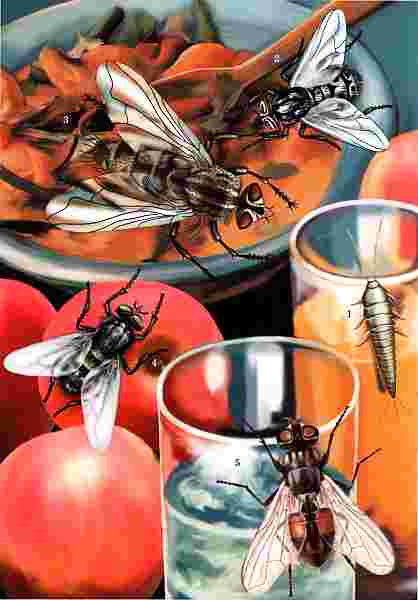 1 — сахарная чешуйница, 2 — муха-жигалка, 3 — муха мясная, 4 — муха домовая, 5 — муха комнатная