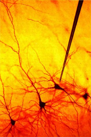 Рис. 34. В зрительной коре обезьяны окраска по Гольджи выявляет лишь несколько пирамидных клеток — ничтожную долю общего их числа в срезе. В действительности высота представленного здесь прямоугольного участка составляет около миллиметра. На микрофотографию наложено изображение (в том же масштабе) типичного вольфрамового электрода, применяемого при внеклеточной регистрации активности нейронов.