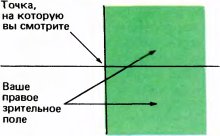 Рис. 37. Правое зрительное поле простирается вправо почти на 90°. В этом легко убедиться, если, быстро сгибая и разгибая палец, медленно смещать его по кругу вправо. Вверх поле зрения простирается на 60° или около того, вниз — примерно на 75°, а влево, по определению, доходит до вертикали, проходящей через точку, которую вы фиксируете взглядом.