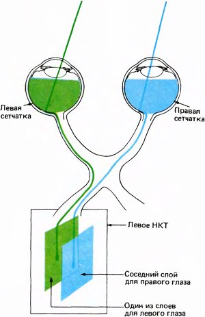 При переходе от сетчатки к НКТ простая схема, в которой каждый последующий слой клеток содержит проекцию предыдущего, становится более сложной. В НКТ проекции от сетчаток двух глаз объединяются, и два отдельных изображения, представленные на уровне ганглиозных клеток в сетчатках, проецируются на шесть слоев НКТ. Волокна от правого и левого глаза не конвергируют на одни и те же клетки НКТ — каждая из этих клеток получает сигналы только от какого-то одного глаза. Два множества клеток разнесены по отдельным слоям, так что в любом слое все клетки получают информацию только от одного глаза. Эти слои расположены таким образом, что проекции от правого и левого глаза чередуются. Так, в левом НКТ проекции располагаются в следующем порядке (от поверхности в глубину): левая, правая, левая, правая, правая, левая. Не совсем ясно, почему последовательность 5-го и 6-го слоев «перевернута» (иногда мне кажется, что это сделано для того, чтобы порядок проекций было труднее запомнить). У нас пока нет никакого вразумительного объяснения самого факта чередования проекций.
