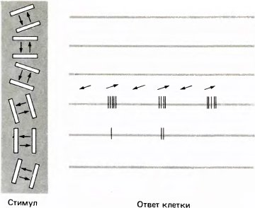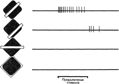 В отличие от клеток на более низких уровнях зрительной системы нейроны, избирательно чувствительные к ориентации стимула, гораздо лучше отвечают на движущиеся, чем на неподвижные линии. Именно поэтому (см. рис. 41) при стимуляции таких нейронов мы использовали линии, движущиеся через рецептивное поле. Если использовать в качестве стимула неподвижную мелькающую (периодически вспыхивающую) линию, то зачастую клетка дает слабый ответ, и в этом случае предпочтительной оказывается такая же ориентация, как и при движущейся линии.