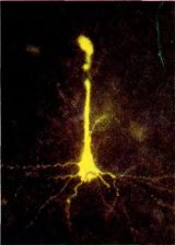Рис. 45. Активность этой клетки из слоя 5 стриарной коры кошки была записана в 1973 году с помощью внутриклеточного электрода Д. Эссеном и Дж. Келли из Гарвардской медицинской школы. Было проведено также картирование ее сложного рецептивного поля. Затем путем инъекции красителя проционового желтого выяснили, что это была пирамидная клетка.