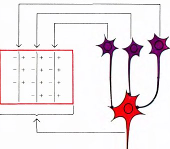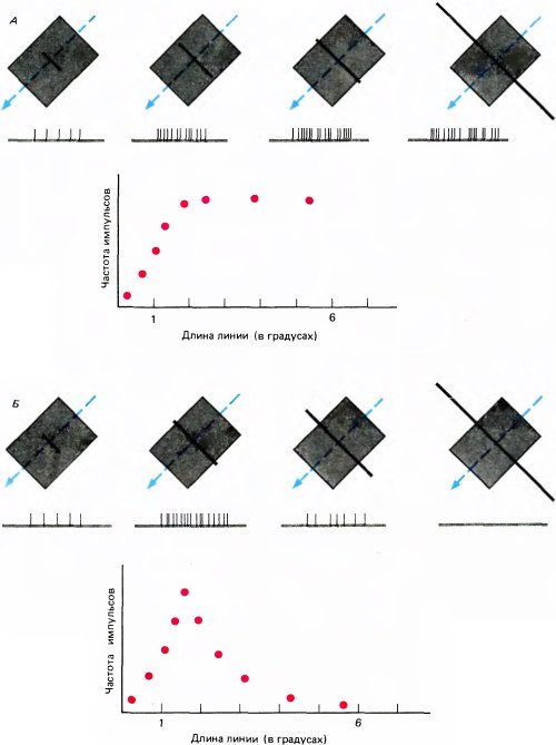 Главная причина того, что в сложных клетках мы видим результат определенной организации клеток с круглыми рецептивными полями с центром и периферией, — это очевидная необходимость производить переработку информации логически в два этапа. Я хотел бы подчеркнуть слово логически, поскольку в целом нужное преобразование, по-видимому, могло бы быть физически осуществлено и в один этап — если суммировать на отдельных разветвлениях дендритов сложных клеток входные сигналы от клеток с круглыми рецептивными полями. В этом случае каждое разветвление выполняло бы функции отдельной простой клетки, посылая к телу клетки (и соответственно к аксону) сигналы электротоническим путем (с помощью пассивного электрического процесса) всякий раз, когда какая-то линия попадет в определенную зону соответствующего рецептивного поля. В этом случае такая клетка сама проявляла бы свойства сложной клетки. Однако само наличие простых клеток заставляет думать, что мы не должны строить таких сложных воображаемых конструкций.