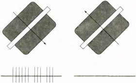 Для того чтобы проверить предполагаемую карту рецептивного поля, составленную путем тестирования маленьким световым пятном, мы попробовали использовать в качестве стимулов другие конфигурации. Вскоре мы выяснили, что чем большую долю той или иной зоны рецептивного поля покрывает данный стимул, тем сильнее выражено возбуждение клетки или ее торможение. Иными словами, имеет место пространственная суммация локальных воздействий. Мы обнаружили также явление антагонизма — взаимного погашения локальных воздействий при одновременной стимуляции возбуждающей и тормозной зоны. Таким образом, для клетки с рецептивным полем, изображенным на рис. 42, А, наиболее подходящим будет стимул в виде узкой полосы, расположенной в рецептивном поле так, чтобы она точно совпадала с возбуждающей зоной и не заходила в тормозную зону (см. рис. 43). Даже незначительное изменение ориентации этой полосы приведет к уменьшению эффективно действующей площади зоны возбуждения и затронет также тормозную зону; в результате частота разряда в ответе клетки уменьшится.