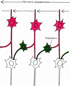 Если прослушивать импульсную реакцию клетки с сильно выраженной дирекциональной избирательностью, то создается впечатление, что при движении линии в одном направлении стимул как бы резко подталкивает клетку и заставляет ее разряжаться, а при движении в противоположном направлении происходит как бы сбой и стимул становится неэффективным (это напоминает ситуацию, когда вы, заводя часы, поворачиваете головку заводного механизма назад и раздается характерный треск).