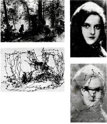 В 1957 году советский психофизик А. Л. Ярбус записал движения глаз испытуемых при рассматривании различных изображений, в частности таких, как сцена в лесу и женское лицо (рис. 50). На этих записях периоды фиксации взора представлены точками, а точки соединены линиями, показывающими траекторию движения глаз во время скачков. Даже беглое ознакомление с этими удивительными записями дает много сведений о работе нашей зрительной системы — даже о том, какие предметы и детали окружающего мира нас больше интересуют.