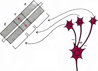Рис. 53. Одна из схем, позволяющих объяснить поведение сложной клетки, реагирующей на концы линий. На такую клетку конвергируют выходы трех обычных сложных клеток; при этом у одной из этих клеток рецептивное поле совпадает по положению с возбуждающей зоной клетки, реагирующей на конец стимула (а), а у двух других клеток рецептивные поля лежат по обе стороны от возбуждающей зоны (б и в). Первая клетка образует на выходе возбуждающий синапс (+), а две другие — тормозные синапсы (–).
