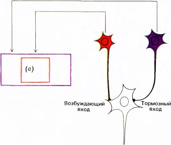 Вначале мы думали, что такие клетки относятся к следующему уровню иерархии корковых нейронов, на уровень выше сложных клеток. Согласно простейшей схеме возможной организации таких клеток, они могли бы иметь один или несколько возбуждающих входов от обычных сложных клеток с рецептивными полями, находящимися в возбуждающей зоне, и тормозные входы от сложных клеток с такой же ориентацией рецептивного поля, расположенных вне зоны возбуждения (эту схему поясняет рис. 53). Согласно другой возможной схеме (рис. 54), клетка имеет возбуждающий вход от клеток с небольшим рецептивным полем (а) и тормозный вход от клеток с большим рецептивным полем (б). Предполагается, что клетки, подающие тормозные сигналы, максимально чувствительны к длинным линиям, но слабо возбуждаются короткими линиями. Эта вторая схема (аналогичная модели клеток, имеющих рецептивные поля с центром и периферией, см. стр. 60) — одна из немногих схем, получивших частичное подтверждение. Чарлз Гилберт из Рокфеллеровского университета в Нью-Йорке установил, что сложные клетки в слое 6 стриарной коры обезьяны имеют как раз те свойства, которые нужны для торможения, предполагаемого в данной схеме. Он также показал, что если инактивировать эти клетки путем локальных инъекций, то расположенные в верхних слоях коры клетки, реагирующие на концы линий, теряют способность отвечать торможением на конец линии.