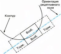 В большинстве случаев по ответам простых клеток на стимул в виде маленького светового пятна можно предсказать их реакцию на стимул сложной формы. Каждая из простых клеток, подобно ганглиозным клеткам сетчатки, клеткам НКТ и корковым клеткам с центрально-симметричными рецептивными полями, имеет небольшое четко очерченное рецептивное поле. Предъявление в пределах этого рецептивного поля стимула в виде светового пятнышка вызывает либо on-, либо off-реакцию в зависимости от того, в какой именно участок рецептивного поля подан стимул. Различие между простыми клетками и клетками предыдущих уровней заключается в конфигурации зон возбуждения и торможения. На предыдущих уровнях это центрально-симметричная конфигурация — имеется одна центральная on- или off-зона (возбуждающая или тормозная) и окружающая ее со всех сторон кольцевая зона с противоположными свойствами (тормозная или возбуждающая). Простые клетки коры более сложны. Зоны возбуждения и торможения в их рецептивных полях всегда разделены одной прямой линией или двумя параллельными линиями (рис. 42). Чаще всего встречается такая конфигурация, когда к длинной и узкой возбуждающей зоне с двух сторон примыкают более широкие тормозные зоны (рис. 42, А).