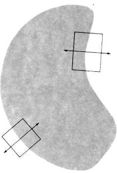 Теперь мы с достаточной уверенностью можем сказать, что именно любая из описанных выше корковых клеток делает в ответ на стимуляцию изображением видимой сцены. Большинство корковых клеток плохо отвечает на диффузное освещение и хорошо — на линии с нужной ориентацией. Так, при показе фигуры, напоминающей по форме почку (рис. 57), такого рода клетка будет отвечать тогда и только тогда, когда участок границы с определенной ориентацией будет пересекать ее рецептивное поле. Те же клетки, рецептивные поля которых расположены внутри границ фигуры, никак не отреагируют — они будут продолжать давать спонтанный импульсный разряд независимо от присутствия или отсутствия данной фигуры.