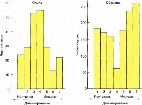 Говоря о таком дублировании связей, нужно сделать одно уточнение. Если, определив для клетки оптимальный стимул, его положение, ориентацию, направление движения и т.д., мы сравним ее ответы при стимуляции одного глаза и при стимуляции другого, интенсивность реакции не всегда окажется одинаковой. Некоторые клетки действительно одинаково хорошо активируются от обоих глаз, однако другие явно дают более сильный разряд при стимуляции определенного глаза. В целом, за исключением той части корковых клеток, которые обслуживают периферию поля зрения, мы не находим никакого особого преимущества того или другого глаза — в каждом полушарии число клеток, лучше активируемых с противоположной стороны (от контралатерального глаза) и с той же стороны (от ипсилатерального глаза), примерно одинаково. При этом встречаются все степени относительного доминирования глаза, начиная от клеток, возбуждаемых исключительно с левого глаза, и кончая клетками, отвечающими только на стимуляцию правого глаза.