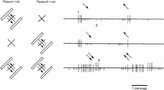 До сих пор я почти не упоминал о существовании двух глаз. Очевидный интерес представляет вопрос: получает ли та или иная корковая клетка входные сигналы от обоих глаз, и если да, то одинаковы ли эти входы в количественном и качественном отношении?
