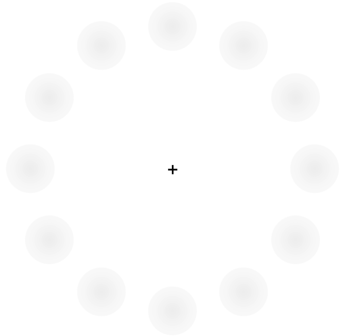 Посмотрите на визуальную иллюзию на рис. 3: двенадцать светло-серых точек вокруг черного креста. Теперь смотрите только на крест. Через несколько секунд часть серых точек побледнеет и как бы исчезнет. Они будут оставаться невидимыми несколько секунд, а потом появятся снова. Порой исчезают все точки, и страница оказывается пуста, но через несколько секунд они появляются снова и имеют более темный цвет, чем прежде.