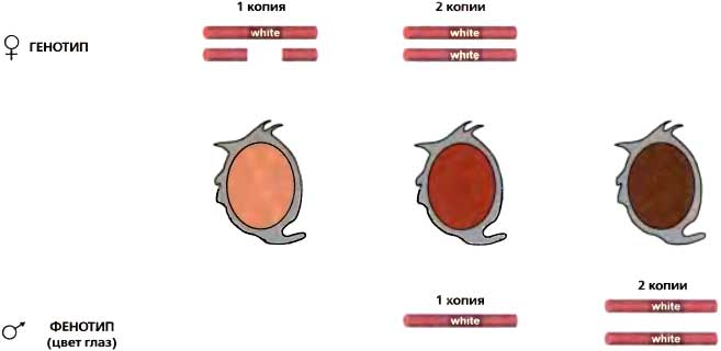 Мутантная аллель (wa) сцепленного с X гена white является гипоморфом и делает возможным лишь частичный синтез глазного пигмента; ее присутствие на Х-хромосомах показано более темным прямоугольником. Уровень пигментации прямо пропорционален дозе аллели wa у каждого пола; тем не менее, самцы с одной дозой и самки с двумя дозами имеют сравнимые количества пигмента благодаря компенсации дозы