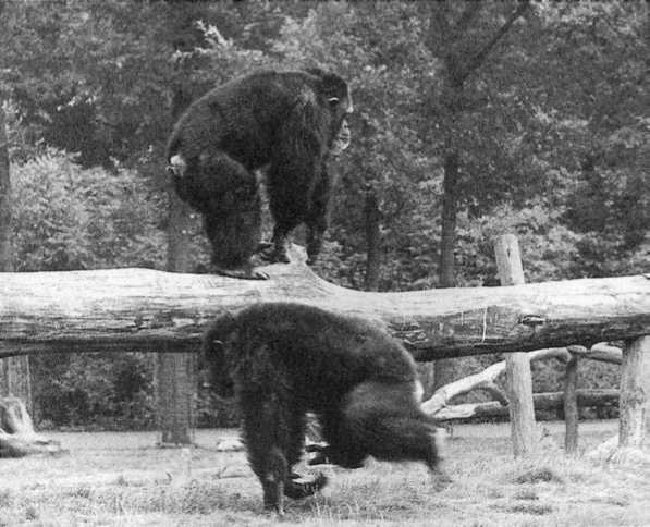 В один прекрасный весенний день в середине апреля 1977 г. колонию выпустили из помещения. В течение следующих нескольких месяцев я все больше убеждался в том, что Лёйт крепко стоит у руля. В поведении Никки по отношению к нему проявлялась угодливость, причем по несколько раз в день: он пытался выглядеть совсем небольшим, его шерсть прижималась к телу, и он громко «приветствовал» его. Если Лёйт прямо приближался к нему, Никки отскакивал назад по-лягушачьи (это движение известно как «подпрыгивание»). В одном из таких случаев он даже забыл оглядеться, а потому, прыгнув назад, оказался во рве (который, к счастью, у берега очень мелкий). Лёйт, несомненно, произвел на него сильное впечатление.