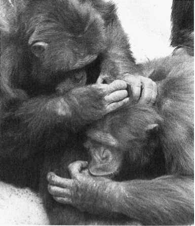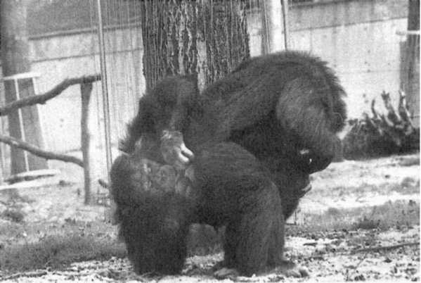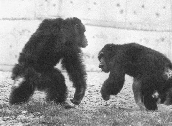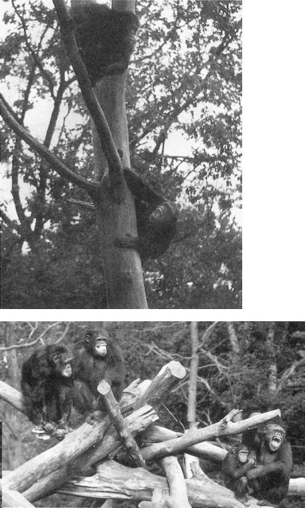 Под открытым небом влияние самок было меньше, поскольку они разбредались по вольеру, однако Лёйт и сам по себе был для Никки опасным противником. Напряжение между двумя самцами становилось наиболее очевидным, когда они оба демонстрировали себя друг перед другом. И Лёйт, и Никки прилагали все усилия, чтобы не показать ни малейшего признака неуверенности в присутствии друг друга: Лёйт по привычке топал ногами по земле, а Никки ухал и бросался камнями, точно выверяя цель. Но когда они были вне поля зрения друг друга, можно было заметить у них явные признаки страха. Это был как раз случай настоящего блефа – в том смысле, что каждый притворялся, будто он смелее и не так напуган, как на самом деле. Например, во время одного из их столкновений, я заметил целый ряд удивительных маскировочных сигналов. После того как Лёйт и Никки демонстрировали себя поблизости друг от друга в течение более десяти минут, начался конфликт, в котором Лёйта поддерживали Мама и Пёйст. Никки загнали на дерево, но чуть позже он начал снова ухать на вожака, продолжая сидеть там же. Лёйт сидел у основания дерева, повернувшись спиной к своему обидчику. Когда он снова услышал вызывающие звуки, он обнажил зубы, однако тотчас поднес руку ко рту и прижал губы друг к другу. Я не мог поверить своим глазам и поспешно навел на него бинокль: на его лице снова появляется нервная усмешка, и снова он пальцами сжал губы. В третий раз Лёйту удалось, наконец, стереть усмешку со своего лица; только тогда он повернулся. Вскоре он начал демонстрировать себя перед Никки, словно бы ничего не случилось, а с помощью Мамы загнал его обратно на дерево. Никки наблюдал, как его противники уходят. Внезапно он повернулся спиной, и когда другие уже не могли его увидеть, на его лице появилась усмешка, и он начал мягко повизгивать. Я мог слышать Никки, потому что стоял недалеко, однако звук был настолько приглушенным, что Лёйт, скорее всего, не заметил, что его противнику тоже было не так-то просто скрыть свои эмоции.